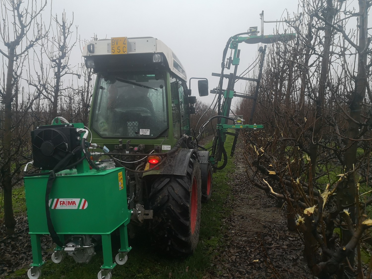 Cimatrice per potatura di frutteti applicata a trattrice provvista di sollevatore frontale o di flangiatura standard